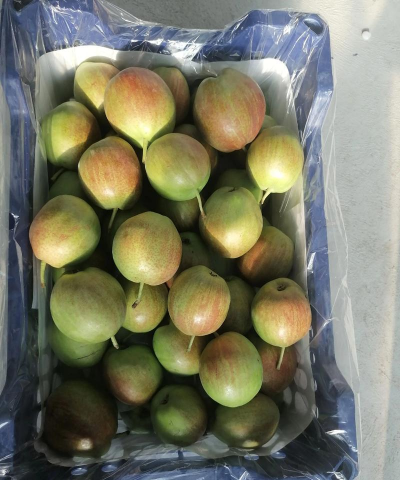 果肉白色,肉质酥脆、多汁,石细胞极少,风味淡甜,品质优。果心小,可溶性固形物含量12.1%,果实耐贮藏,普通土窖可贮藏至翌年4~5月。