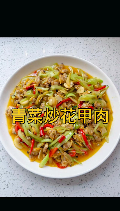 制作花甲肉要先将花甲放入盐水中浸泡使它吐尽体内泥沙,再用沸水将它焯至开口,然后将肉取出一个个清洗干净,锅中入油加入大葱段、蒜蓉、生姜、泡椒、干辣椒、耗油以及酱油炒香,再放入备好的花甲肉,翻滚爆炒两分钟撒上盐出锅。