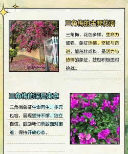 1、热情奔放,三角梅花色以大红色为主,看似热情似火。2、坚韧不拔,三角梅可以在恶劣的环境下迎难向上生长。3、没有真爱是一种悲伤,三角梅代表着内心对于真爱的渴望和向往。4、三角恋,不要轻易将三角梅送给亲戚朋友,以免引误会。