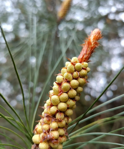 松树:雌球花发育为松果,种子裸露在种鳞上;雄球花密集释放黄色花粉。