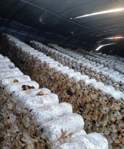 发酵完成后装袋密封,高压或蒸汽消毒12-24小时,冷却后接种香菇或滑菇菌种。