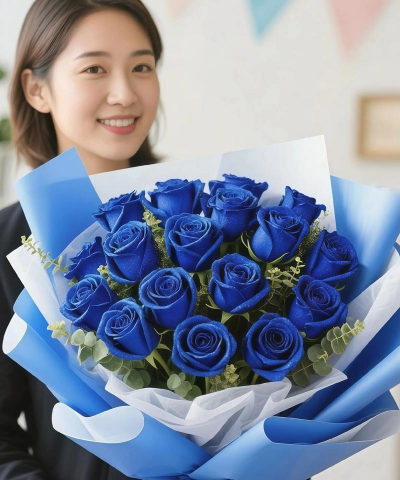 通过化学染色剂将白玫瑰花瓣染成鲜亮蓝色,颜色自然且持久,花瓣数量通常为10-20片。