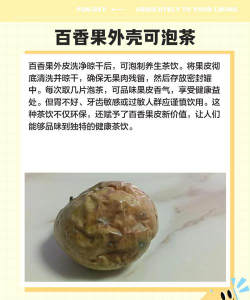 百香果壳含有多种天然解毒、消炎成分和大量植物纤维,可解酒保肝、消炎杀菌、促进身体代谢。百香果的壳的食用方法有很多,并不能直接的食用,而是将其洗净后再利用,可以用来做汤、泡茶、泡酒、做成果脯来食用。不过一般食用时,都会将果壳丢弃。