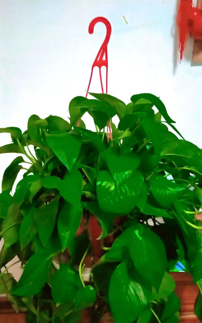 青叶绿萝最常见的品种,虽非天生垂吊,但枝条生长速度快,可通过悬挂或修剪引导其下垂,形成绿帘效果。