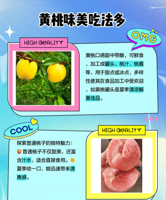 此外,黄桃和普通桃子在烹饪和用途上也有一些区别。由于黄桃的果肉较为柔软多汁,适合生食和制作果汁、水果沙拉等。而普通桃子的果肉相对较硬,更适合制作水煮桃子、烘焙食品以及腌制等料理。