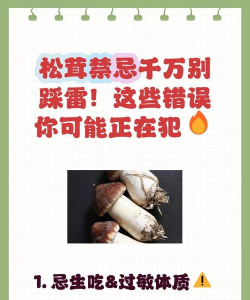 松茸中成分复杂,因此,过敏体质的人不适合多吃,以免引起过敏。松茸能生吃,也能熟吃,但是生吃的松茸必须新鲜,变质变色的松茸不适合食用。