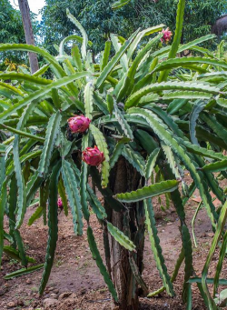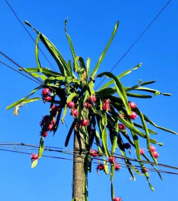 火龙树是仙人掌科量天尺属(Hylocereus)或蛇鞭柱属(Seleniereus)的肉质灌木,原产于中美洲热带沙漠地区(如巴西、墨西哥),现广泛栽培于我国南方热带、亚热带地区(如广西、广东、福建、海南)。其为攀援性植物,依赖气生根附着支撑,是常见的热带果树。