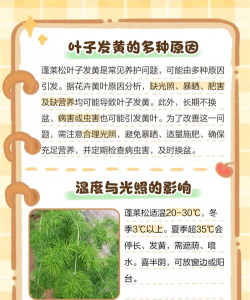 蓬莱松黄叶需根据具体原因对症处理,通常与环境养护不当有关。定期检查光照、水肥、土壤等条件,并保持适宜的生长环境,可有效预防黄叶问题。
