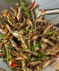 锅中先不放油,倒入辣椒炒软,然后放入适量油、盐和蒜瓣炒香,并将小鱼干倒入锅中翻炒,加入适量耗油翻炒均匀,即可出锅。