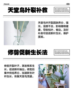 当天堂鸟的叶子出现开裂时,可采取以下措施进行处理:更换透气且疏松的土壤、喷洒水雾保湿并保持良好通风、做好保暖措施确保温度不低于5℃、遮阳防晒并适当补水。此外,还可以增加施肥的频率和量,促进叶片修复。通过这些措施,可以使天堂鸟恢复健康生长,并延长其观赏寿命。