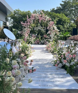 除了捧花、胸花和餐桌鲜花外,墙壁装饰也是婚礼现场不可忽视的一部分。想象一下,当宾客们走进会场时,一面面由鲜花和绿叶装饰而成的墙壁映入眼帘,仿佛置身于一个唯美的花园之中。各种花卉的巧妙搭配和覆盖墙壁的装饰方式,不仅能够创造出令人陶醉的视觉体验,更能够凸显出婚礼的主题和氛围。这样的装饰方式,无疑将为整个婚礼增添几分高雅与浪漫。