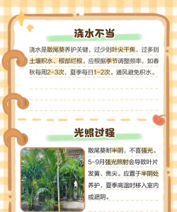 光照不当散尾葵喜半阴环境,强光直射会导致叶片焦黄(尤其是叶缘和叶尖),而长期光照不足则会使叶片暗淡发黄。夏季需遮阴50%,避免烈日暴晒。