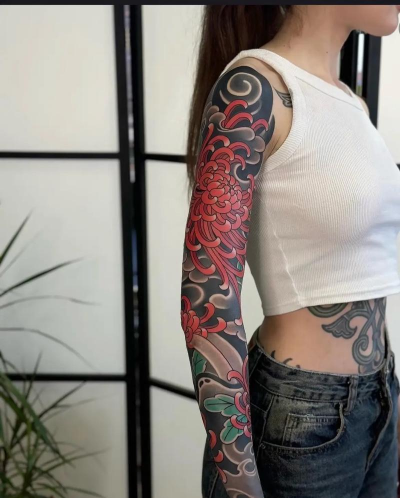 整体花臂从设计之初就作为完整构图,元素间有连贯性,常见于日式传统或写实风格,需纹身师具备较强的立体布局能力。