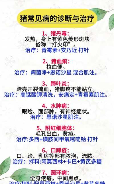针对猪附红细胞体病的治疗,目前常用的药物主要有贝尼尔、新胂凡钠明、对氨基苯胂酸钠和四环素等。贝尼尔按5~7毫克/千克体重深部肌肉注射,间隔48小时重复用药一次。新胂凡钠明按10~15毫克/千克体重静脉注射,但副作用较大,现在使用较少。对氨基苯胂酸钠则是对病猪群每吨饲料混入180克,连用一周,以后改为半量,连用一个月。四环素按3毫克/千克体重肌肉注射,24小时即见临床改善也可连续应用。