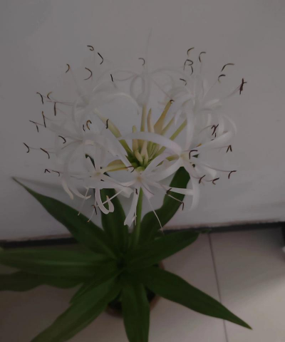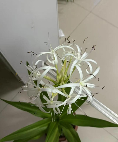 文殊兰是一种多年生粗壮草本植物,属于石蒜科文殊兰属。它的鳞茎长圆柱形,叶片深绿色,呈线状披针形,边缘波状,先端渐尖具尖头。花茎直立,与叶近等长,花朵芳香,花被高脚碟状,裂片白色,线形,雄蕊淡红色,花丝长,花药线形。其花期在夏季,果期在10月。