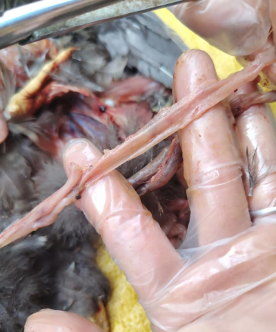 剖检可见十二指肠后的小肠肠壁增厚出血。剖开肠道可见扁平节片相连的白色虫体。用镊子挑起虫体有弹性,松开后恢复原状。