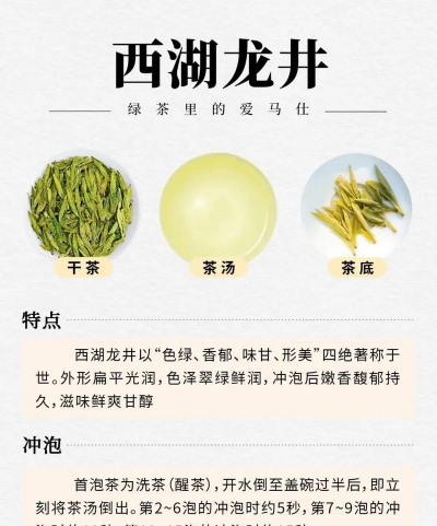 2.香气与口感:龙井茶香气清高持久,香馥若兰,这种独特的香气是龙井茶的一大特色。口感方面,龙井茶滋味鲜爽甘醇,入口后有一种清凉感,回甘强烈,让人回味无穷。
