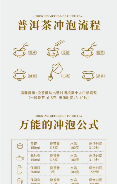 熟普:由于经过长时间渥堆发酵,冲泡时水温要达到100℃,以充分泡出熟茶的顺滑、香甜和醇厚口感。