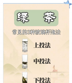 2.中投法:先将开水注入杯中约1/3处,待水温凉至80℃左右时,将茶叶投入杯中少顷,再将约80℃的开水徐徐加入杯的七分满处,稍后即可品茶。龙井、太湖绿、六安瓜片、绿阳春等大多采用中投法。