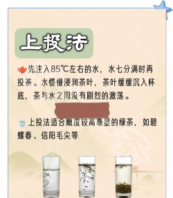 1.上投法:先冲水后投茶,适用于特别细嫩的茶,如碧螺春、信阳毛尖等。不适宜松散型或毛峰类茶叶,会使茶叶浮在汤面。先将开水注入杯中约七分满(倾茶七分满)的程度,待水温凉至80℃左右时,将茶叶投入杯中,稍后即可品茶。