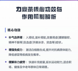 力鼎茶是一种养生类的保健食品,但它并不是药物,在饮用时应该遵循适量原则,避免过量饮用,其功效和作用主要体现在以下几个方面。