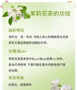 6.疏肝明目:茉莉花茶有润肤养颜,面色暗哑无华,有排毒养颜的功效。茉莉花茶还有松弛神经的功效,因而想消除紧张情绪的人不妨来一杯茉莉花茶,在获得幸福感的同时,也有助于保持稳定的情绪。用茉莉花茶漱口,既去油腻、又具坚固牙齿、防止口臭的作用。