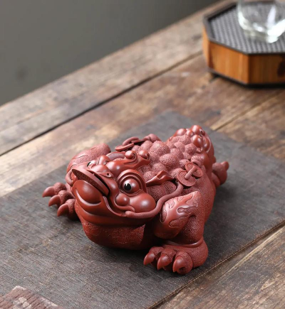 金蟾,特别是三足金蟾,在汉族神话传说中,被描绘为月宫中的一只三条腿的蟾蜍,后人也因此将月宫称为蟾宫。三足金蟾被视为吉祥之物,能够招财致富。在茶具上放置金蟾,寓意着招财进宝,希望茶叶的香气和热气能够滋养金蟾,从而增强其招财的能力。