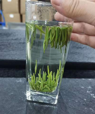 7.闻香品茗:品饮竹叶青茶先闻香,再观汤色和杯中上下浮动玉白透明形似兰花的芽叶,然后小口品饮,茶味鲜爽,回味甘甜,口齿留香。饮用至茶杯1/3处时即可再次续水。