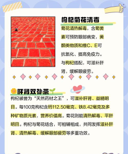 7、保肝护肾:菊花和枸杞都具有一定的护肝、肾的功能,有助于排毒和调节肝肾功能。