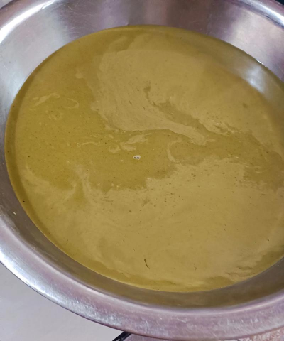 锅里倒入适量的植物油,将醒好的面揪下一小块,用手压平后,用手捏住两头,拉一拉,抻一抻,丢入油锅,两面炸得金黄酥脆即可,此为油馓子。锅里水烧温时,下炒香的米粉搅匀,熬制成略稀的糊状,熟后舀进碗里。碗内放进化猪油、油酥花生粒、芝麻面、榨菜粒、芽菜末,最后放进油馓子即成,也可撒入香菜。