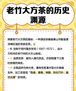 1、历史悠久:老竹大方茶由安徽茶农创制于明朝,清代已入贡茶之列,具有四百多年的悠久历史。