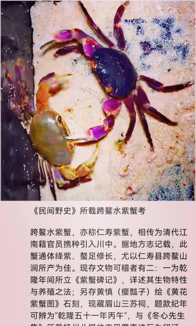 紫蟹是中华绒螯蟹(又称河蟹或毛蟹)的一个特殊品种,其独特的紫色蟹黄和丰富的营养价值而著称。主要产于中国天津市及其周边地区,尤其是水质清澈、水草丰富的淡水湖泊或江河。紫蟹体形小巧,但蟹黄饱满,呈现出一层鲜艳的紫色,生时色泽类似猪肝,熟后则转为诱人的桔红色,味道鲜美无比。紫蟹不仅是当地的美食佳肴,还因其独特的品质和历史背景,成为了中国蟹类文化中的一部分。