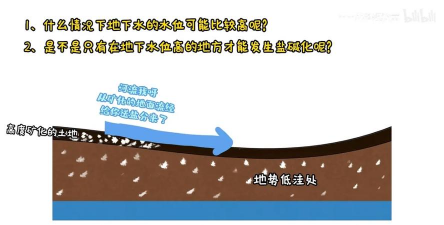 土壤中的毛细管现象使得地下水中的盐分能够随毛管水上升到地表。当地下水位较高时,更为明显。水分蒸发后,盐分便在土壤表层积累,形成盐碱化。