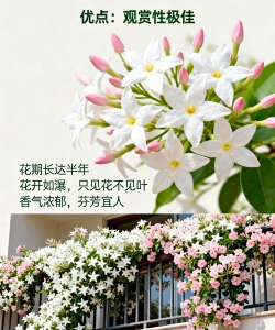 络石(风车茉莉):夹竹桃科常绿藤本,花白色芳香,耐阴耐寒,适合围墙、柱形造型。