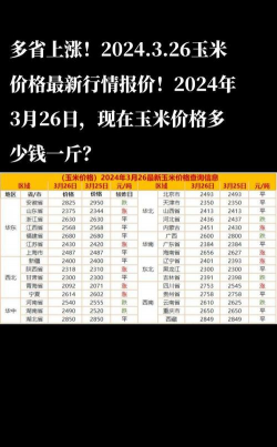 玉米的价格因地区、品种、品质等因素而有所不同。例如,在重庆市江北区干玉米1.26元/斤;重庆市巴南区干玉米1.35元/斤;四川南充市高坪区干玉米1.3元/斤;贵州安顺市镇宁布依族苗族自治县干玉米1.3元/斤;云南西双版纳傣族自治州景洪市干玉米1.5元/斤;甘肃武威市凉州区干玉米1.4元/斤;甘肃张掖市高台县干玉米1.4元/斤;新疆伊犁哈萨克自治州伊宁县干玉米1.53元/斤;天津市宝坻区干玉米1.2元/斤。