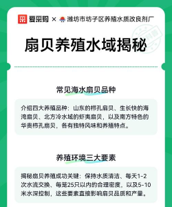 (1)水深和水质:扇贝养殖需要足够深的水域,通常要求水深至少8米,最佳在15米以上。水质应清澈,透明度至少4米,且富含单细胞藻类作为饵料。