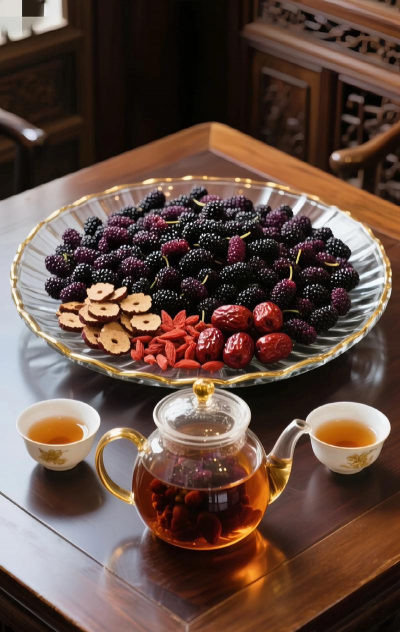桑葚干中含有丰富的铁元素,有助于补血,同时还含有多种维生素和矿物质,对皮肤有养颜功效。