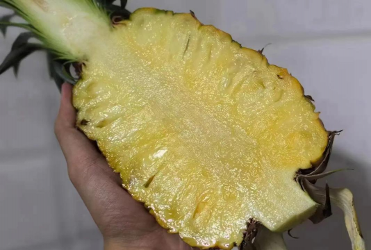 捏一下菠萝,成熟的菠萝应该是硬中带软的,捏它时,会稍稍陷进去一点。掂一掂菠萝的重量,重的菠萝汁水更加丰富。
