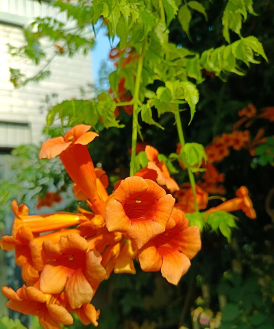 凌霄花喜光照,也耐半阴。在生长期,需要晒足太阳,才能让它枝繁叶茂,开花旺盛。若长期处于荫蔽环境,植株生长不良,枝叶发生徒长,瘦弱枯黄,通常每天都要接受超过6小时的光照时间。夏季强光,需要适当遮阴。冬天,可以全日照养护,整天都可以暴露在阳光下。