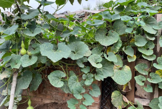 攀援表现:葫芦秧生长迅速,藤蔓缠绕支架时表现出极强的韧性,即使被风雨吹落也会重新攀爬。