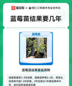 蓝莓树一般2年结果。在蓝莓树种植下去的第二年就能够结果,但产量很低,第5年才会进入盛果期,需要为其提供疏松肥沃的偏酸性土壤,浇水施肥要做到适度适量少量多次施加,保证充足适宜的每日光照时长即可。