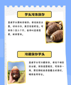 将芋头削皮后切成片或块,放入密封袋中,存放在冰箱的冷冻室内,可以保存至少半年以上。但芋头冷冻后口感会变得柔软,烹饪时需注意火候。