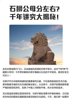 雕狮子是传统文化中的重要象征,主要应用于宫殿、庙宇、府邸以及现代建筑和园林装饰中。在传统文化中,狮子被视为瑞兽,具有镇宅、辟邪、招财等寓意。而石雕狮子通常成对出现,分为公狮和母狮,分别具有不同的象征意义和造型特点。下面,小编将为大家详细介绍石雕狮子公母如何分辨。
