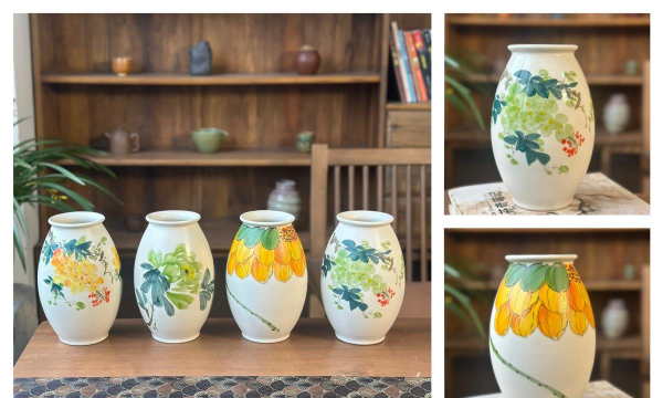 陶瓷器皿包括陶器、瓷器,工艺精良且色彩丰富,具有中国传统特色,适合古典或雅致的插花风格。例如宋代的官窑花瓷、青花瓷等常用于宫廷或文人插花。