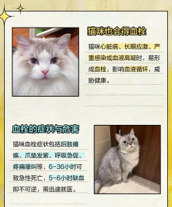 突然出现呼吸困难可能是肺部血栓的迹象,有些猫可能会咳出血液或血性粘液,呼吸困难,或突然死亡。心丝虫病、蛋白质丢失的肾脏或肠道疾病、癌症和免疫介导的溶血性贫血与肺部血栓有关。