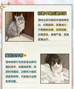 猫通常没有肾脏疾病的迹象,直到它们处于第三或第四阶段,此时它们的肾脏工作能力不到平时的25%。例外的是患有其他疾病的猫,这些疾病会影响整个身体或肾脏,导致异常发炎或疼痛,并引起呕吐或疼痛。兽医可能能够在猫出现肾功能衰竭迹象之前,通过血液检测或体检发现问题。通常,最早的症状是过度口渴和排尿。然而,这些迹象也可能预示着其他疾病,直到第二或第三阶段才开始出现。随着疾病在几个月到几年内的进展,其他问题也开始出现。这些症状包括食欲不振、体重减轻、脱水、口腔溃疡、行动迟缓、呕吐和腹泻。