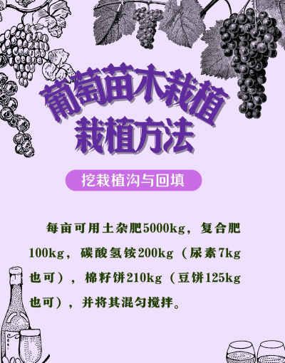 葡萄栽植采用沟植法,沟宽30-40厘米,深20-30厘米。株距1.5-2米,行距2.5-3米。栽植后及时浇水,确保成活。