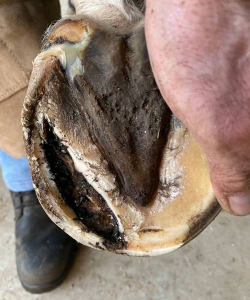 当异物穿透脚底时,它会引入可引起感染的微生物。感染和脓液囊很容易形成。穿刺伤口后的跛行通常很严重,尤其是当脚负重时;跛行的程度可能与骨折产生的程度相似。马可以站立并指向受影响的脚。脚部疼痛加剧,触摸时可能会感到温暖。感染可能会进展到冠状动脉带,冠状动脉带会膨胀和破裂。随后,浆糊和胎儿闭锁区域积聚液体并肿胀。诊断需要通过拉鞋、使用蹄测试仪和削掉可疑区域以定位异物或其进入路径来确认疼痛部位。