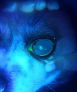 为了检测小溃疡,兽医可能会将荧光素染料滴入眼睛。浅表溃疡通常通过局部抗生素和纠正任何机械因素来控制。兽医经常开药来减轻眼部疼痛。深部溃疡的医学治疗与浅部溃疡相似,但许多深部溃疡也需要手术移植物来加强和保持角膜的完整性。